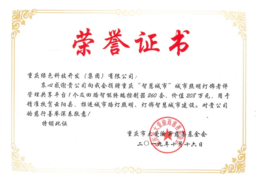 10月16日,重慶綠色科技開發(fā)(集團(tuán))有限公司為支持國家級重點貧困縣精準(zhǔn)扶貧工作,積極推進(jìn)智慧城市建設(shè),通過重慶市大愛渝商慈善基金會,向云陽縣市政設(shè)施管理所捐建了回路智能終端控制器260套,以及配套建設(shè)重慶“智慧城市”城市照明燈飾四級考評管理共享平臺1個,總價208萬元,用于解決云陽縣城市路燈照明智能化管理的問題,幫助云陽縣實現(xiàn)市政府在《重慶市城市綜合管理提升行動方案》提出的城市照明“一把閘刀”管理的要求。